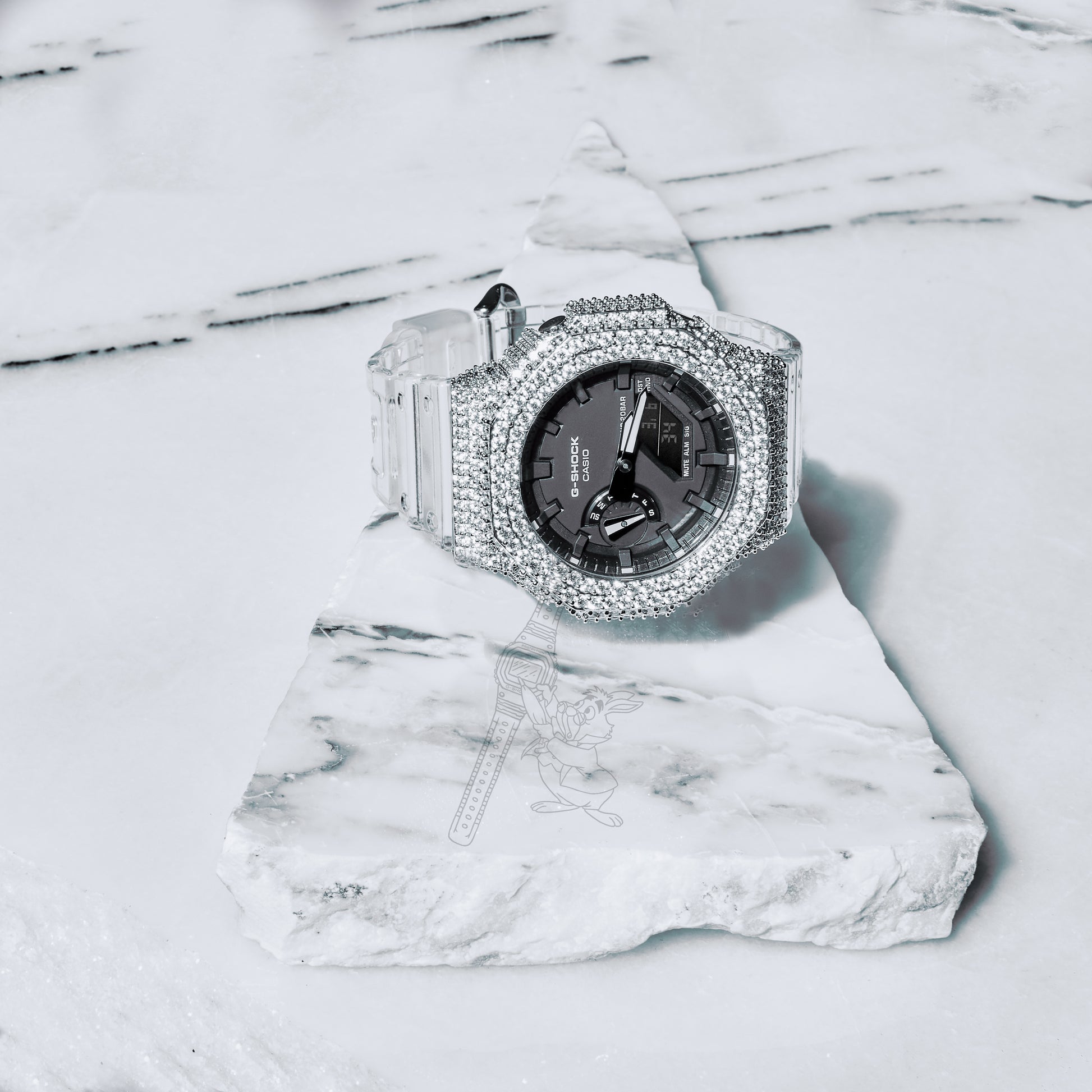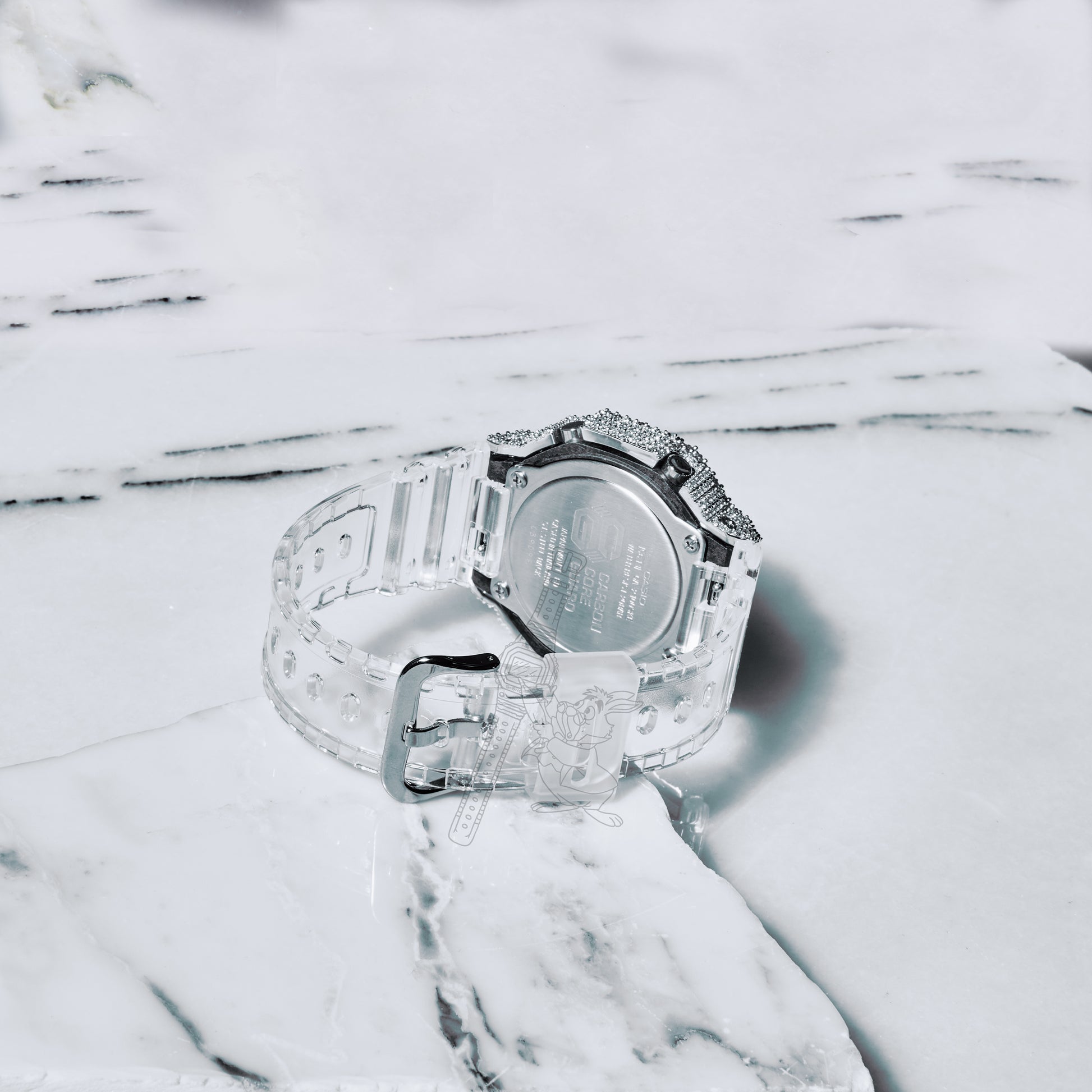The contrast between the clear resin case and the brilliant moissanite bezel creates a unique statement piece that blends G-Shock toughness with luxury-inspired styling.