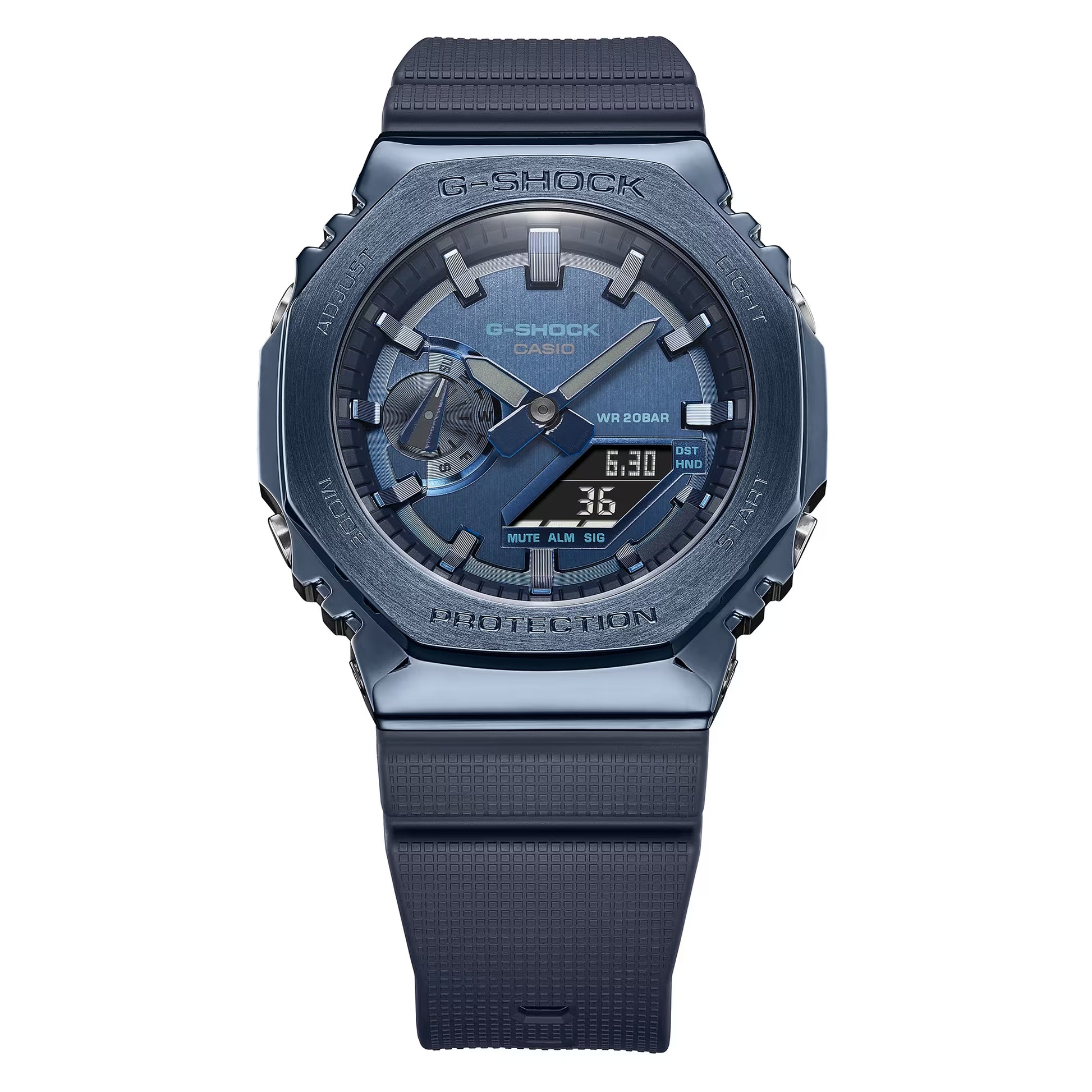 Go sleek, sharp and bold with the new blue band and dark gray IP bezel GM2100N-2A in a metal-clad octagonal take on the original iconic design.